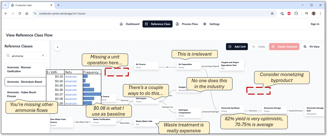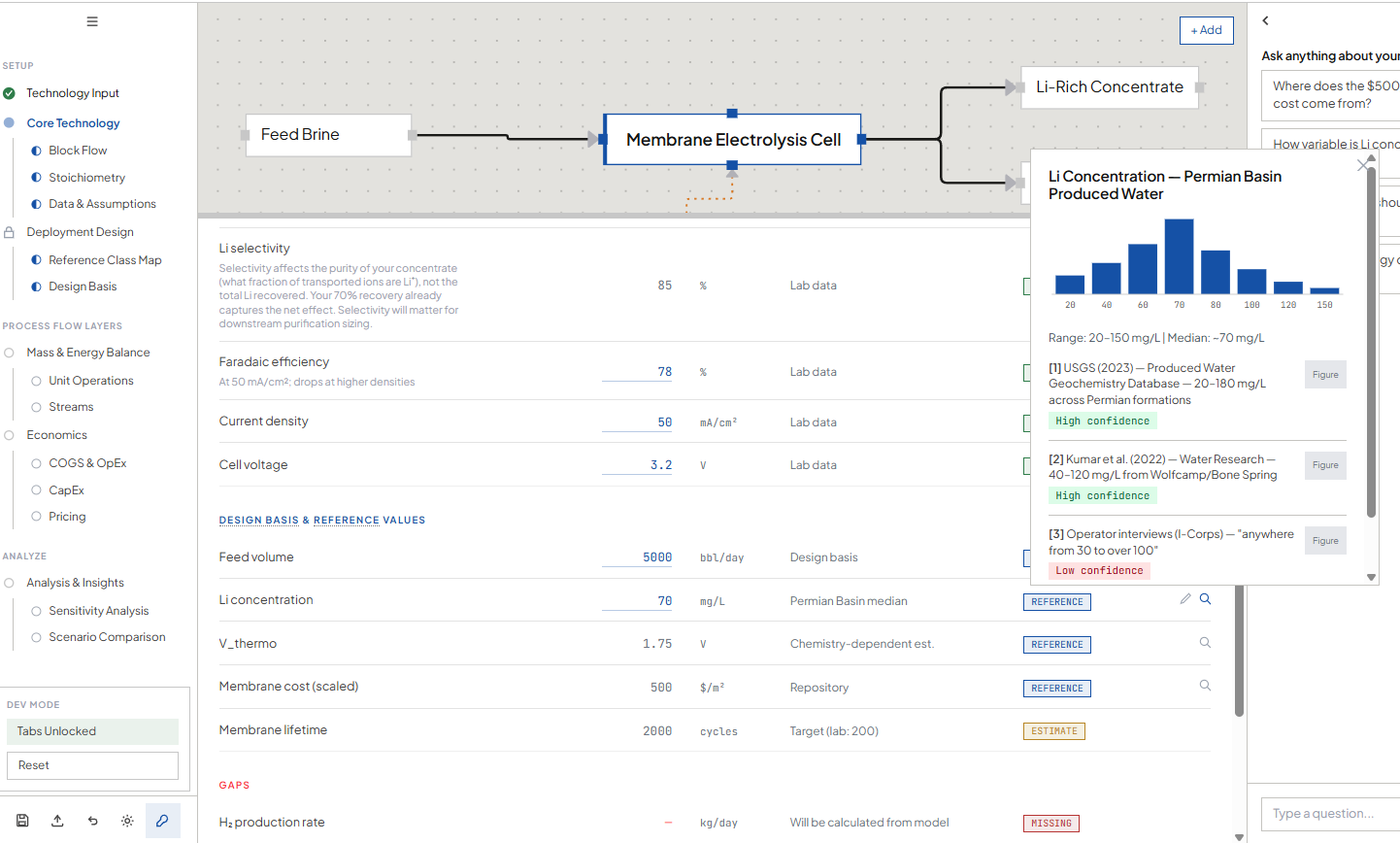 A working draft TEA takes 20–25 focused hours. But teams routinely spend months getting there, because every assumption becomes a mini research project. What does a commercial-scale electrolyzer actually cost? How is carbon capture typically structured at this process stage? Is this yield assumption reasonable, or am I off by an order of magnitude? Each question can mean days of searching across scattered reports, academic papers, and vendor quotes — often arriving at ranges so wide they undermine confidence in the whole exercise.